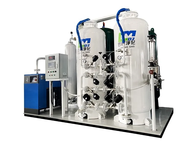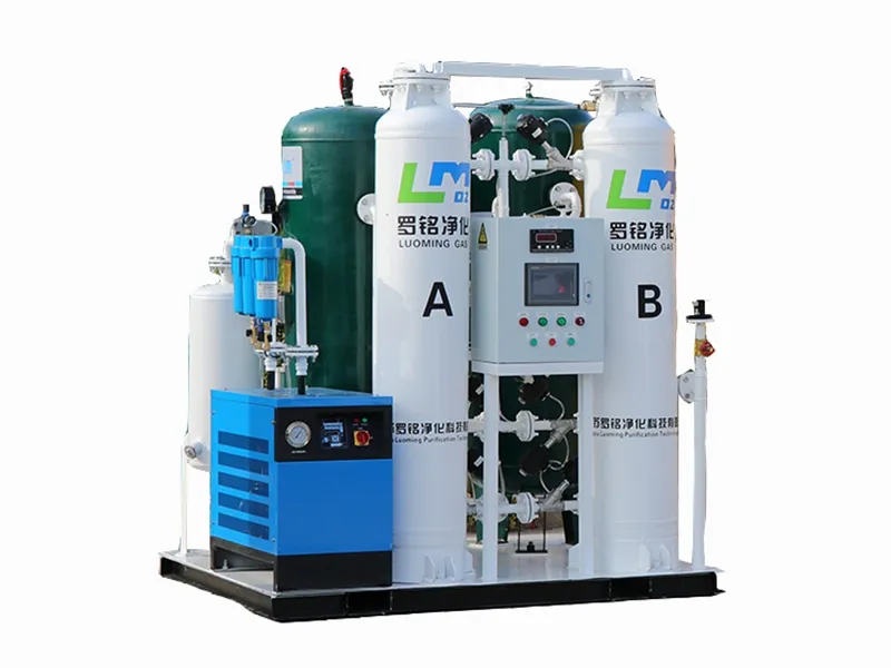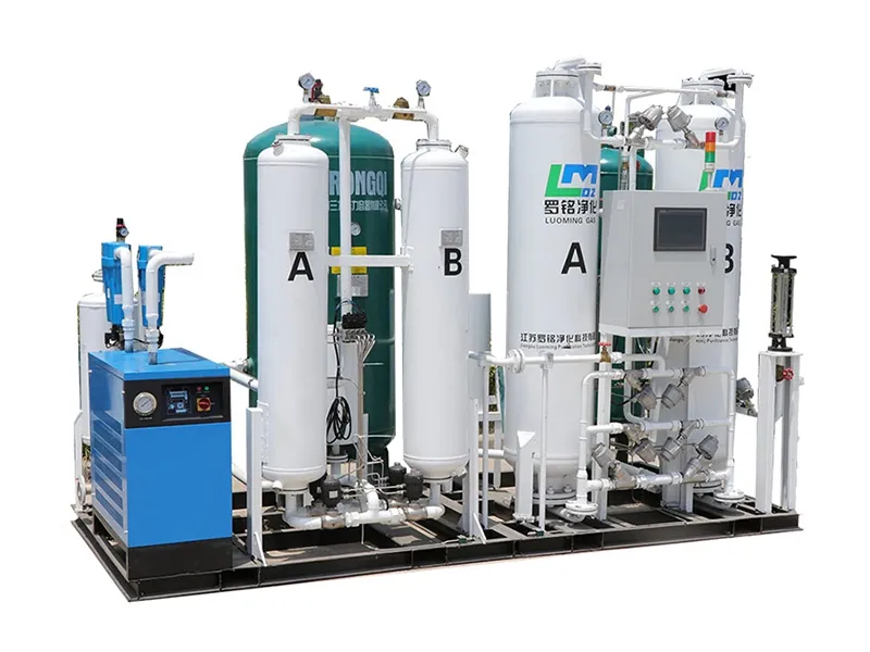 Deux tours d’adsorption fonctionnent en cycles alternés. Tandis qu’une tour est en phase d’adsorption pour produire de l’oxygène, l’autre subit une dépressurisation pour désorber les impuretés et assurer la régénération. Les vannes commandées par PLC gèrent la commutation fluide entre les tours afin de garantir un débit d’oxygène continu et stable. - Post-traitement et stockage: